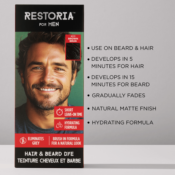 Say Goodbye to Greys - Fast. Restoria Hair & Beard Dye in Dark Blonde is the no-fuss solution for natural-looking grey coverage - made for men, built for ease. This easy, brush-in formula delivers subtle, seamless colour in just 5 minutes for hair and 15 minutes for beards. Whether you're covering early greys or refreshing your look, Restoria blends effortlessly with your natural shade- with a matte, neutral finish that never looks shiny or obvious. Infused with Avocado Oil and Seaweed Extract, Restoria Hair & Beard Dye hydrates while it colours - leaving your hair and beard looking soft, healthy and groomed.